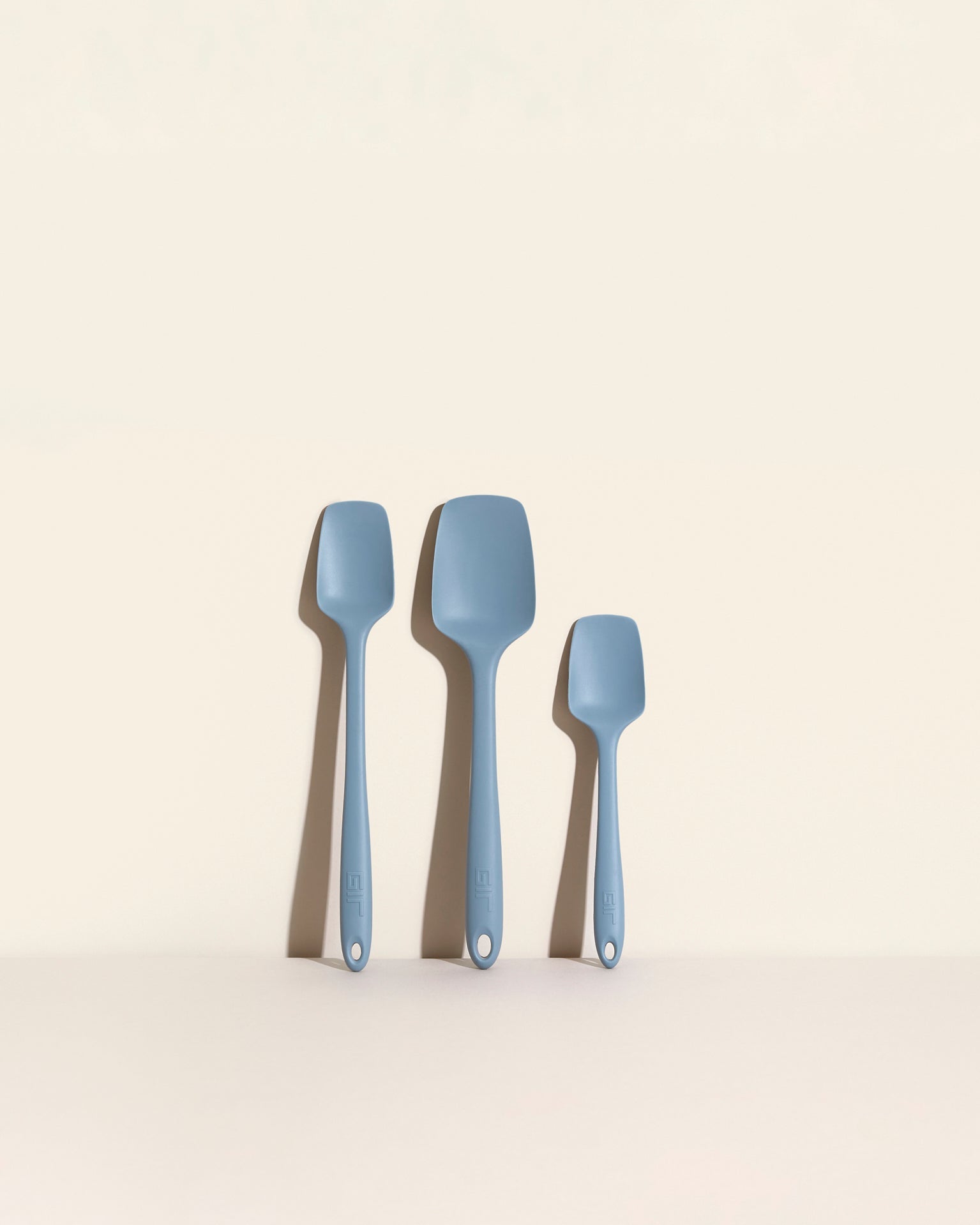 Part spoon, part spatula x 3! Stock your kitchen with our favorite multipurpose utensil in the right size for every kitchen task. Use the Ultimate to stir and scoop main dish meals; the Skinny to scrape every last bit out of tall, narrow jars; and the Mini to get little chefs involved in the kitchen.